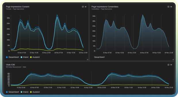 - Erfassung ohne Consent: Die Messung erfolgt anonym und cookielos. Es werden ausschließlich technische Daten verarbeitet, die keine persönliche Identifikation zulassen. IP-Adressen werden nicht dauerhaft gespeichert, personenbezogene Informationen werden konsequent ausgeschlossen.